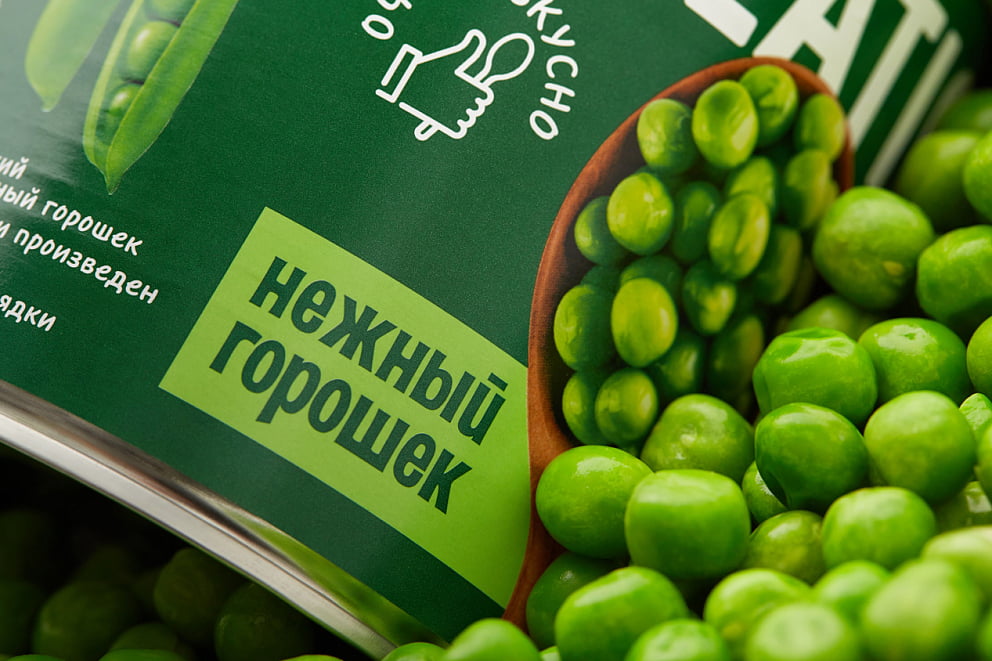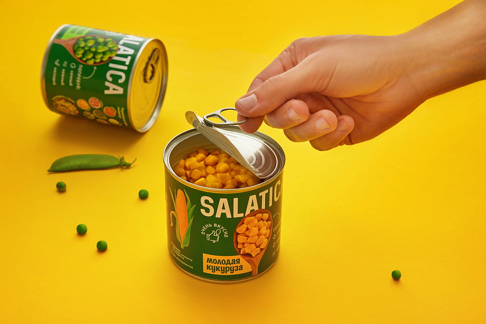 Консервированные горошек и кукуруза чаще всего используются как ингредиент для салатов и других блюд, что уже было отражено в названии. Fabula Branding продолжила развивать эту идею в дизайне упаковки.