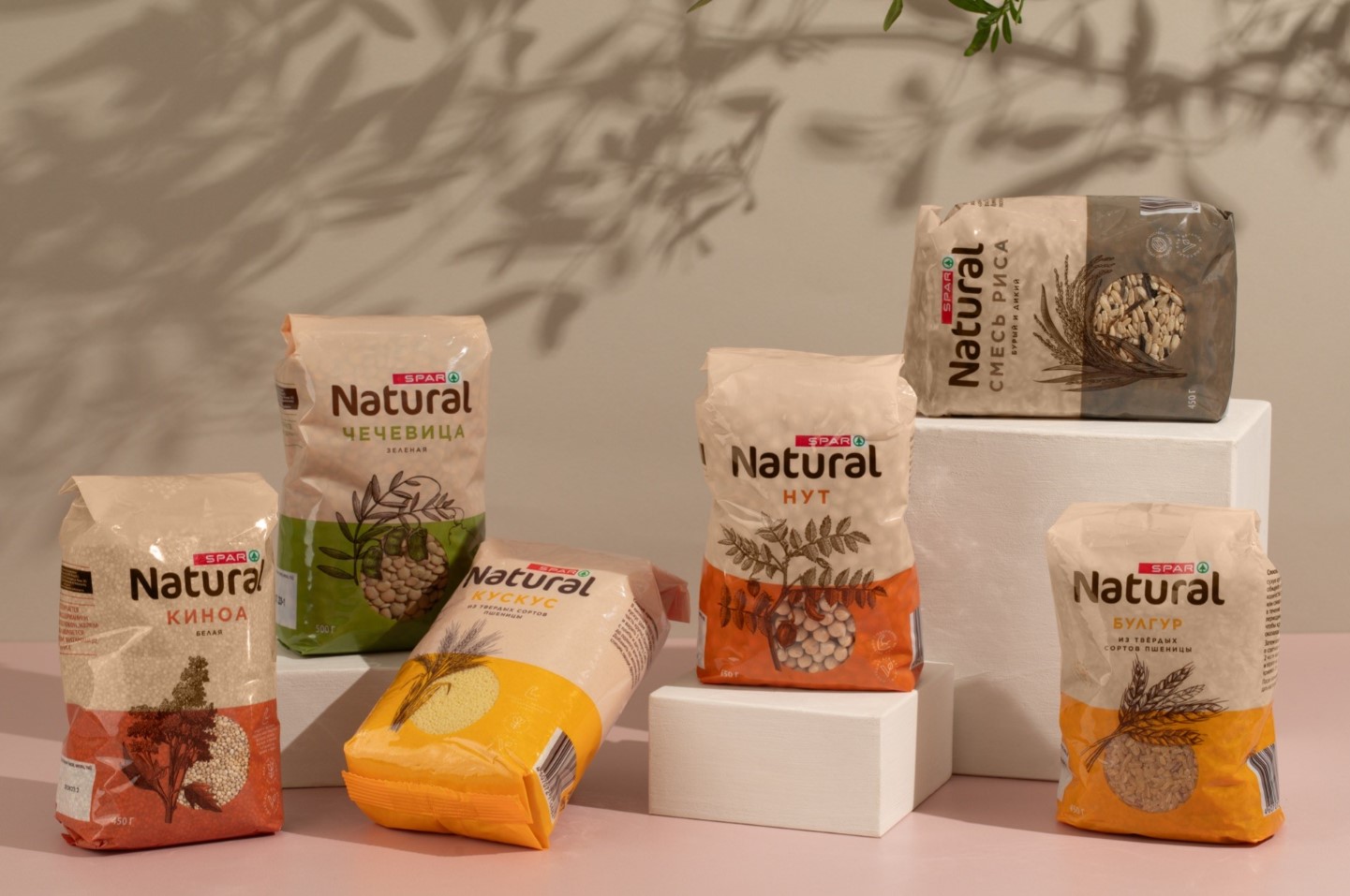 Сеть супермаркетов Spar несколько лет выпускает собственную СТМ здоровой еды SPAR Natural. Отличительной особенностью марки всё это время был насыщенный коричневый цвет. Однако с увеличением SKU на полках дизайн стал казаться мрачным и тёмным, потребовалось освежить дизайн упаковки.