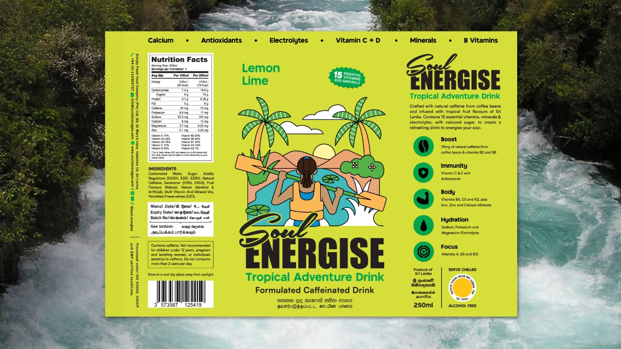 Это свежее имя на рынке, наполненном мужественными, ориентированными на спортсменов упаковками. Чтобы выделить продукт из всех аналогов, наполненных вредными ингредиентами и добавками, Soul Energise оформлена так, что создаёт ощущение хорошего настроения с фокусом на активный отдых где-нибудь на острове.