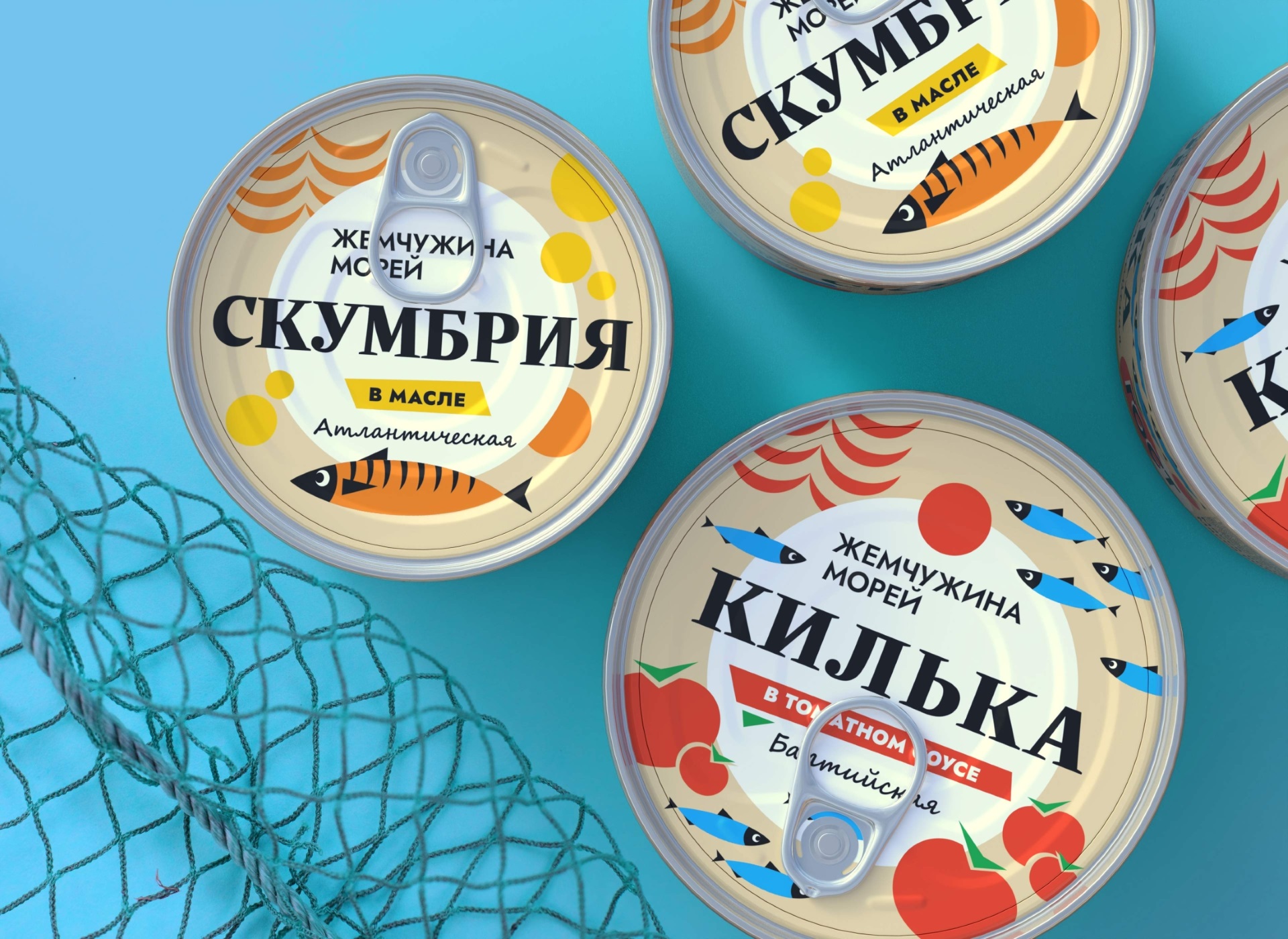 Выбранная концепция представляет собой лаконичный дизайн с современной графикой, которая ассоциируется с морской тематикой. Для дифференциации продукции были использованы цвет и графические элементы. На упаковках кильки и горбуши в томатном соусе появились стилизованные томаты, рыба в масле выделена жёлтым цветом. Продукция бренда имеет единую стилистику, которая хорошо выделяется на полке и привлекает внимание покупателей.
