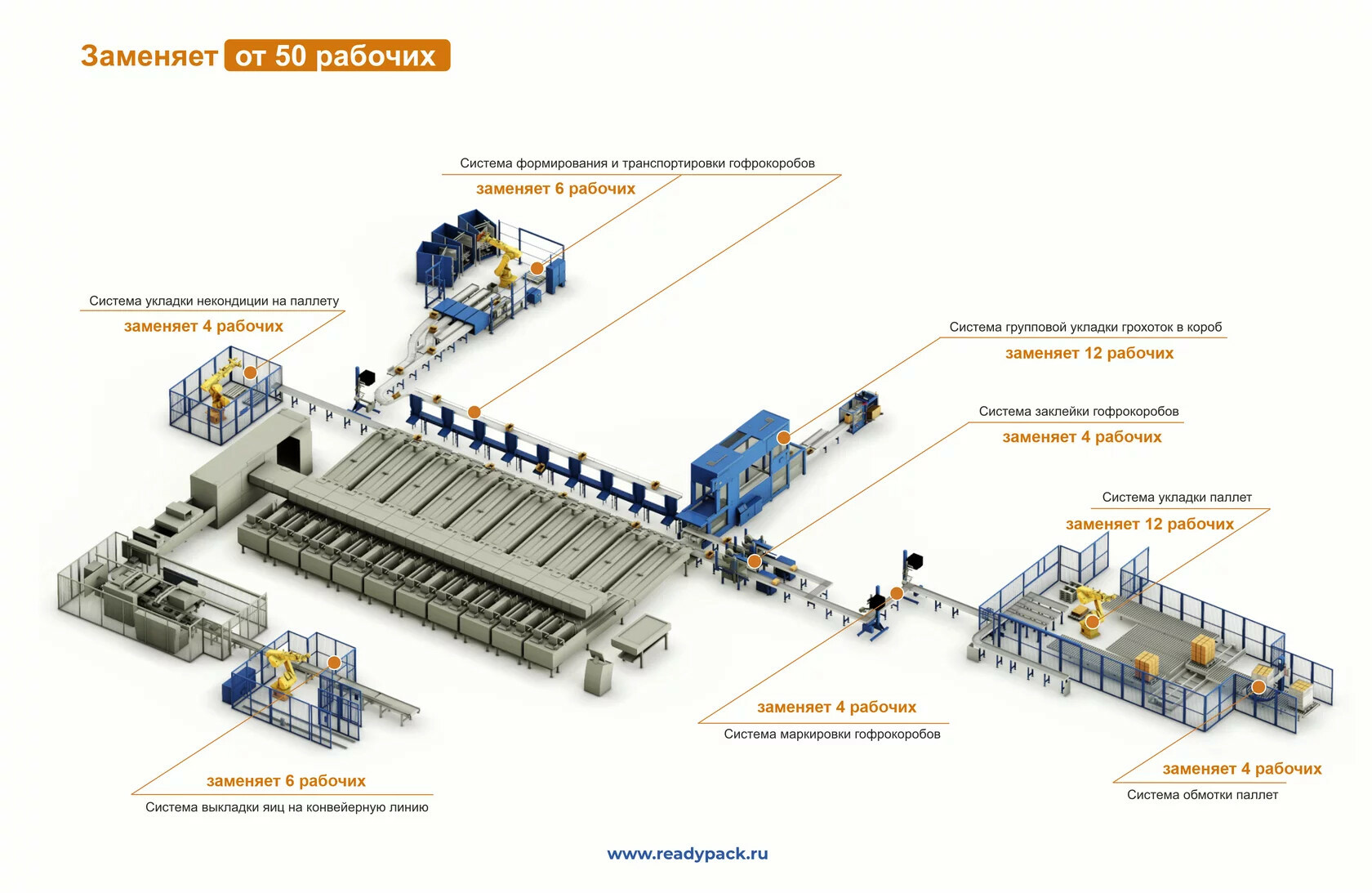 «По сравнению с другими отраслями пищевой промышленности яичные производства наименее автоматизированы. На большинстве птицефабрик имеется яйцесортировочная машина, но дальше — на трудоемких участках упаковки яиц, преобладает ручной труд. Но и там не хватает рук. Всем известно о нехватке рабочих в пищевой отрасли, оттоке трудовых мигрантов после снижения курса рубля и удорожании ручного труда. В таких условиях роботы и автоматизированные системы — не просто средства оптимизации, они становятся основными средствами производства, без которых сложно гарантировать стабильность поставок яйца на рынок», — пояснил генеральный директор «Рэди Робот» Денис Потепалин.