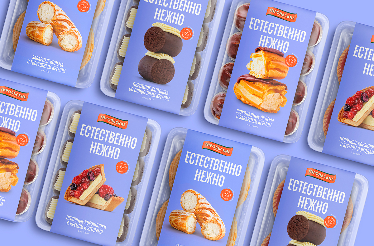 ТМ «Тирольские пироги» (ЗАО «Круг») выпускает кондитерские изделия. Брендинговое агентство «Ферма» провело аналитику рынка и разработало дизайн упаковки для новой десертной линейки. Важно было сохранить преемственность с брендом и отразить идею ресторанных вкусов в среднем сегменте.