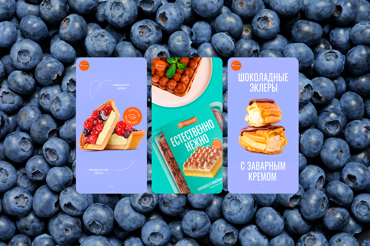 В проекте нам важно было максимально показать продукт. Для этого мы провели профессиональную фотосъемку с фудстилистом и использовали фотографии в разрезе. Они помогают продемонстрировать аппетитную начинку и сочные слои десертов.