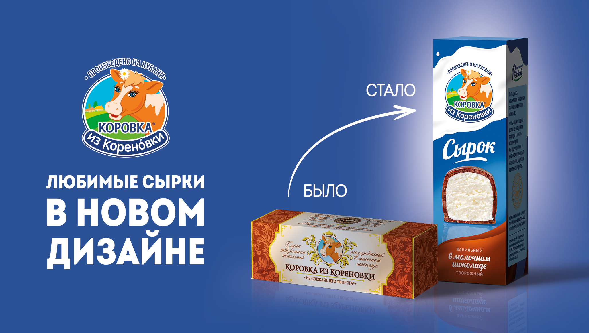 Теперь творожные сырки — в молочном шоколаде, темном, белом, с карамелью, цукатами апельсина и клубникой — еще легче найти на прилавке: дизайн упаковки стал более современным и уникальным в категории творожных глазированных сырков, а также более информативным за счет изображения продукта и его ингредиентов. Это продолжение визуального решения, используемого в линейке мороженого «Коровка из Кореновки».