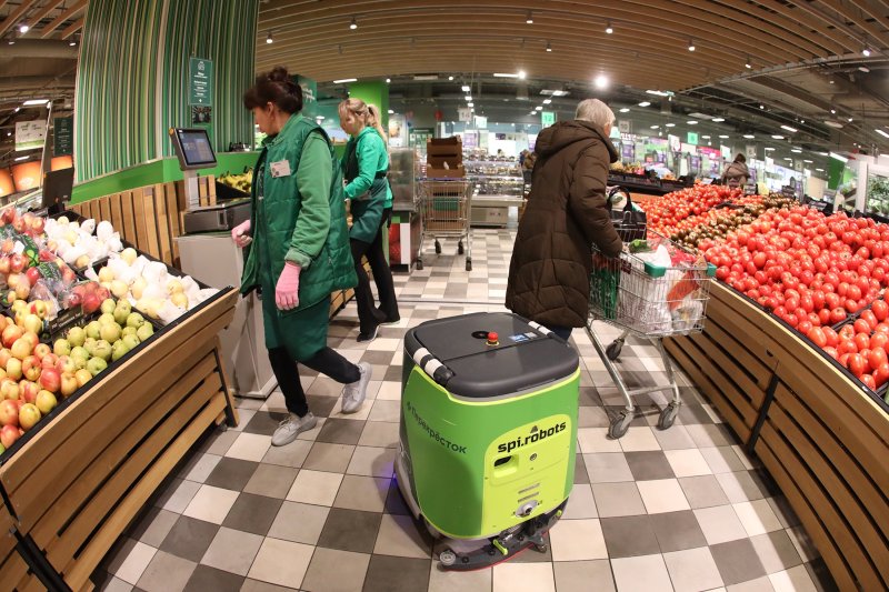 Компанию роботу-коту составляет робот-уборщик. Он следит за чистотой и моет полы специальными щетками. «Пока мы смотрим за их работой, а если роботы покажут свою эффективность, то пригласим их на работу и в другие супермаркеты», — добавил Евгений Бабаев. По его словам, за каждым роботом приглядывает отдельный сотрудник, чтобы изучить все настройки и отследить возможности новых героев.