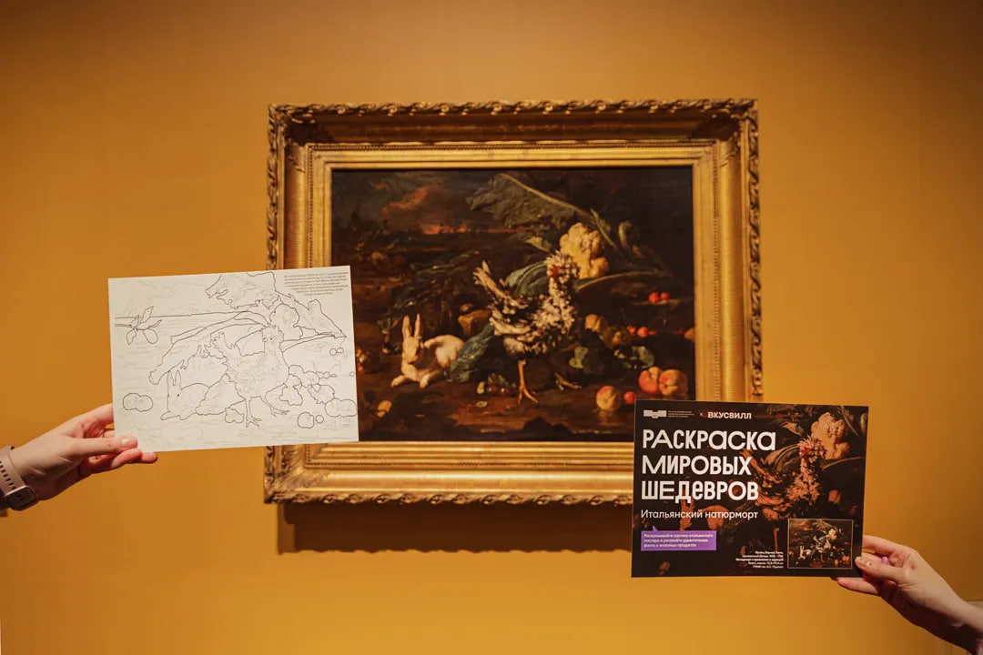 Для детей в ассортименте сети появится раскраска по мотивам произведений Франца Вернера Тамма «Натюрморт с кроликами и курицей» и Якопо Кименти да Эмполи «Натюрморт с фруктами, зеленью, двумя неощипанными утками и сыром».