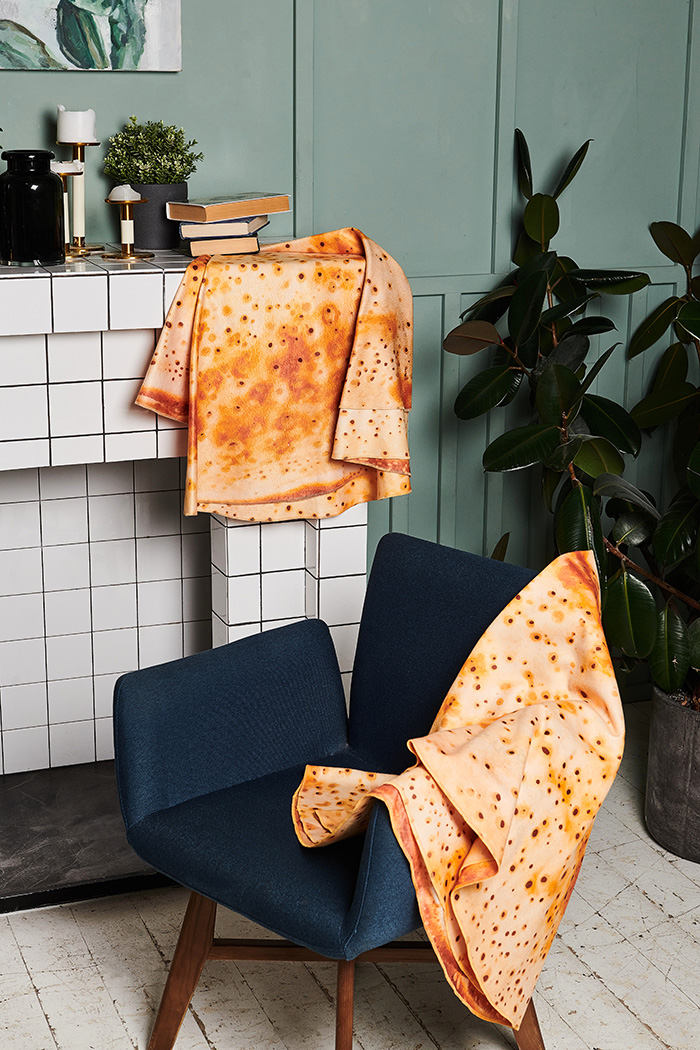 Новинка представляет собой двусторонний плед круглой формы диаметром 1,5 метра, принт которого в точности повторяет изображение тонких блинчиков, традиционно обжаренных на сливочном масле.