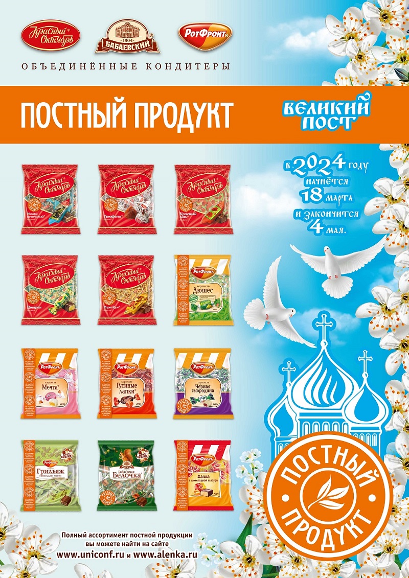 Предприятия, входящие в состав Холдинга «Объединенные кондитеры», год от года расширяют линейку постных кондитерских изделий: леденцы, шоколад, печенье, шоколадные конфеты. Ознакомиться с полным ассортиментом продукции фабрик Холдинга и выбрать подходящие сладости для предстоящих постных недель можно на сайте интернет-магазина alenka.ru, где постный ассортимент выделен в специальную категорию товаров.