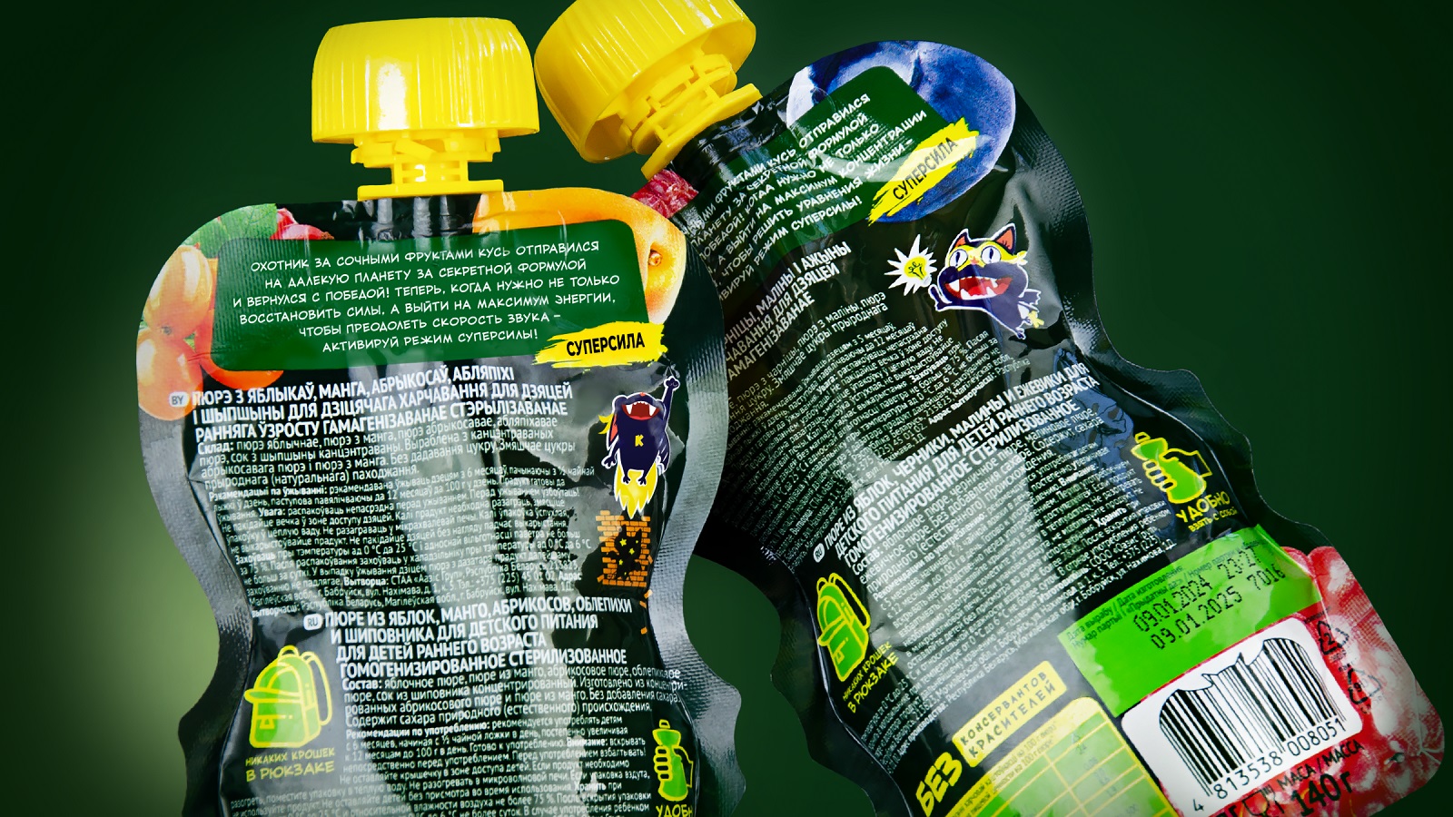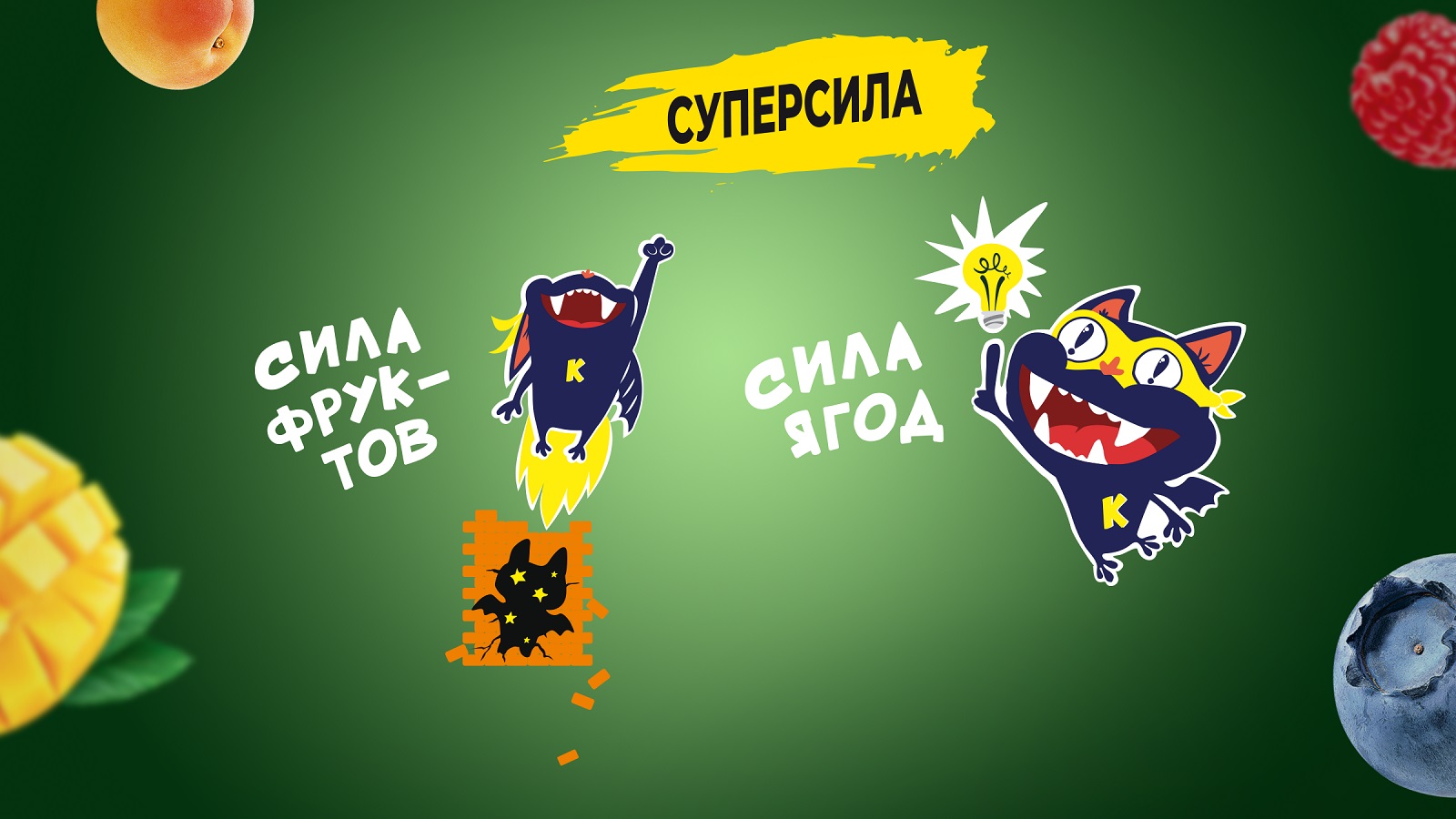 Для фона упаковки был выбран глубокий зеленый цвет, на котором контрастно выделяются сочные фрукты и ягоды. Дружелюбный бренд-персонаж Кусь изображен в супергеройском образе, что помогает потребителю отличить саб-линейку от других продуктов бренда.