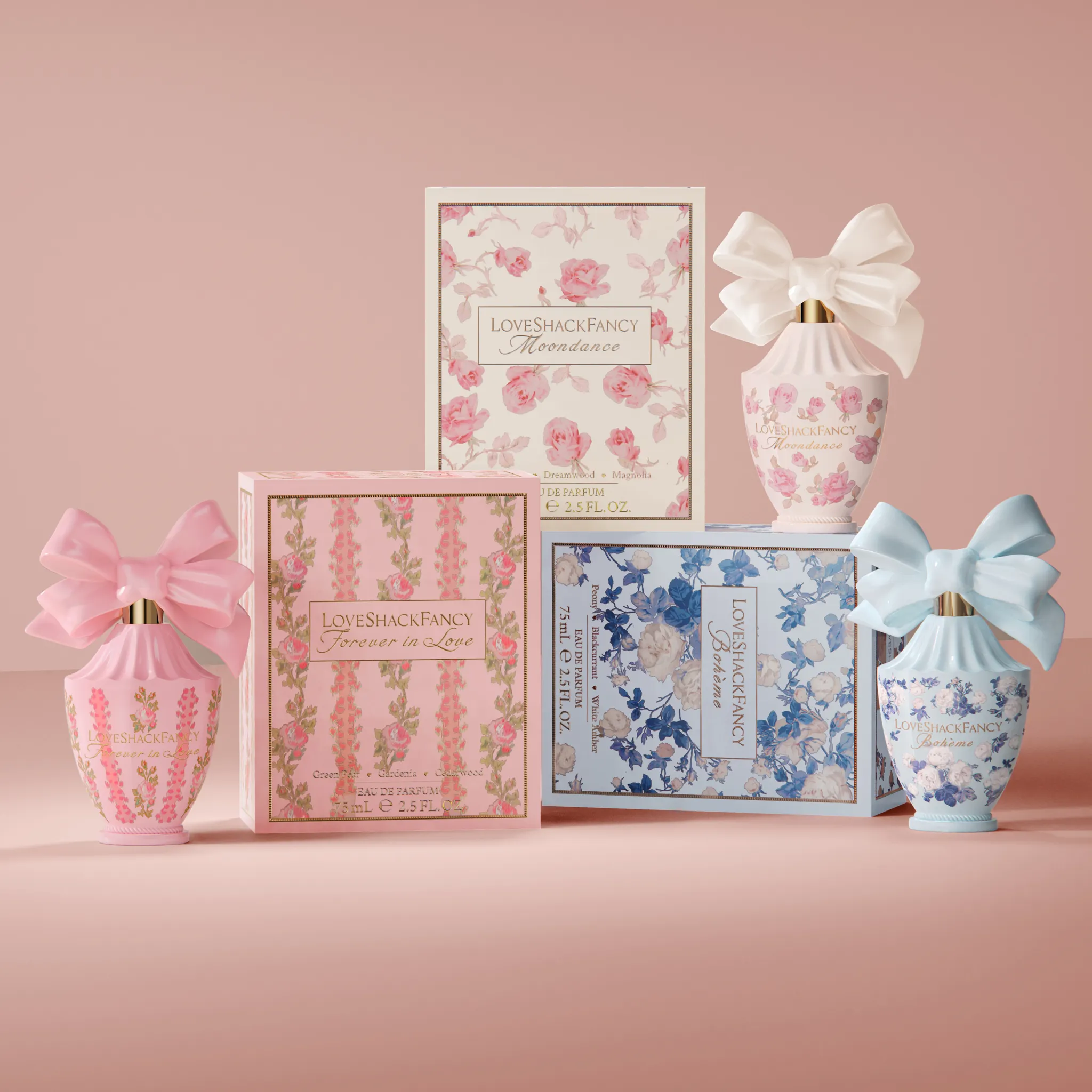 Ультра-женственные керамические флаконы в стиле рококо мгновенно привлекают внимание. Крупные банты и милые детали, такие как старомодные изображения цветов и элегантные золотистые шрифты, позволяют линейке парфюмерии сразу броситься в глаза. Дизайн флаконов позволяет использовать их и после того, как духи закончились. Они могут стать идеальной вазой или фамильной ценностью.