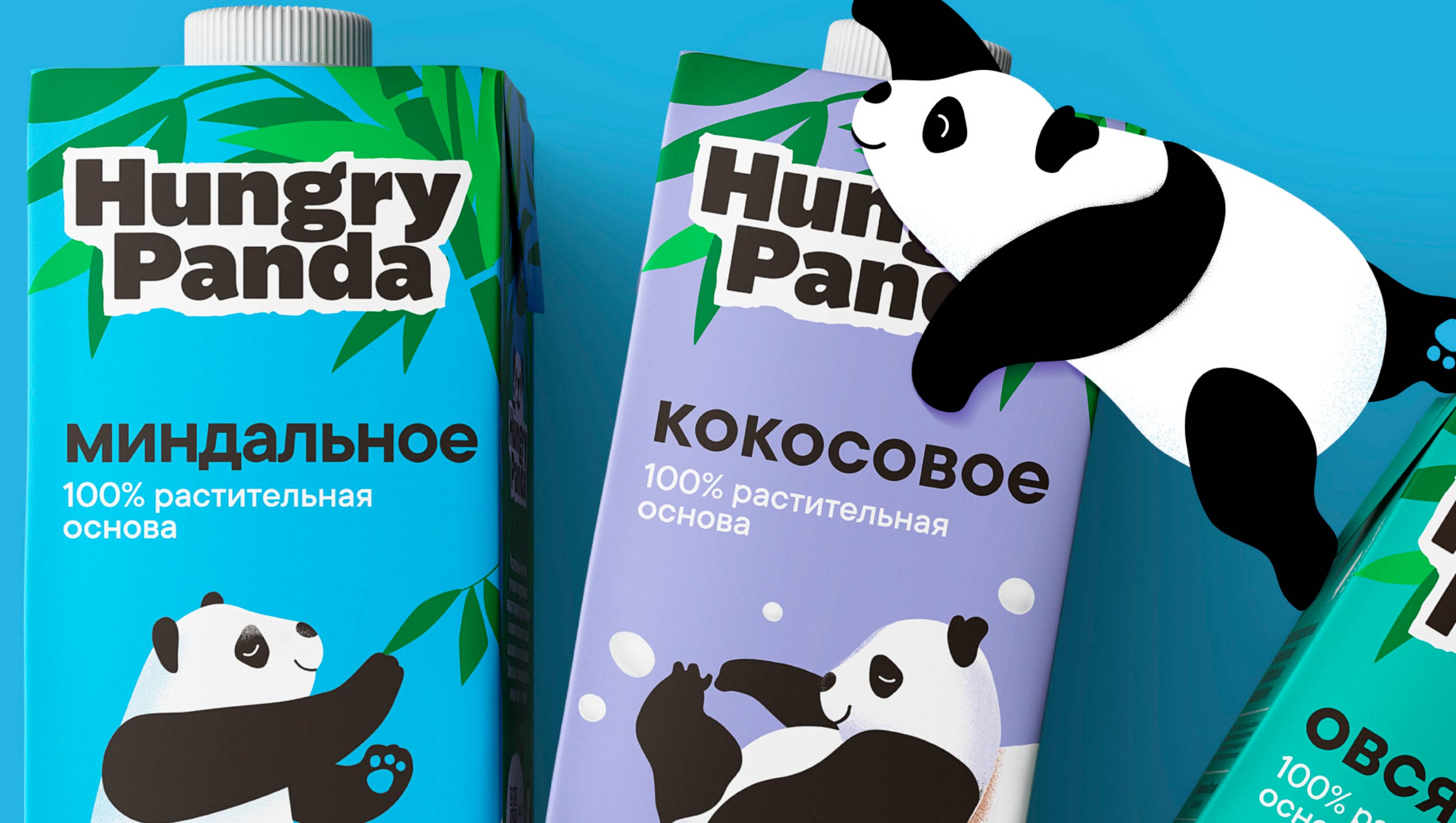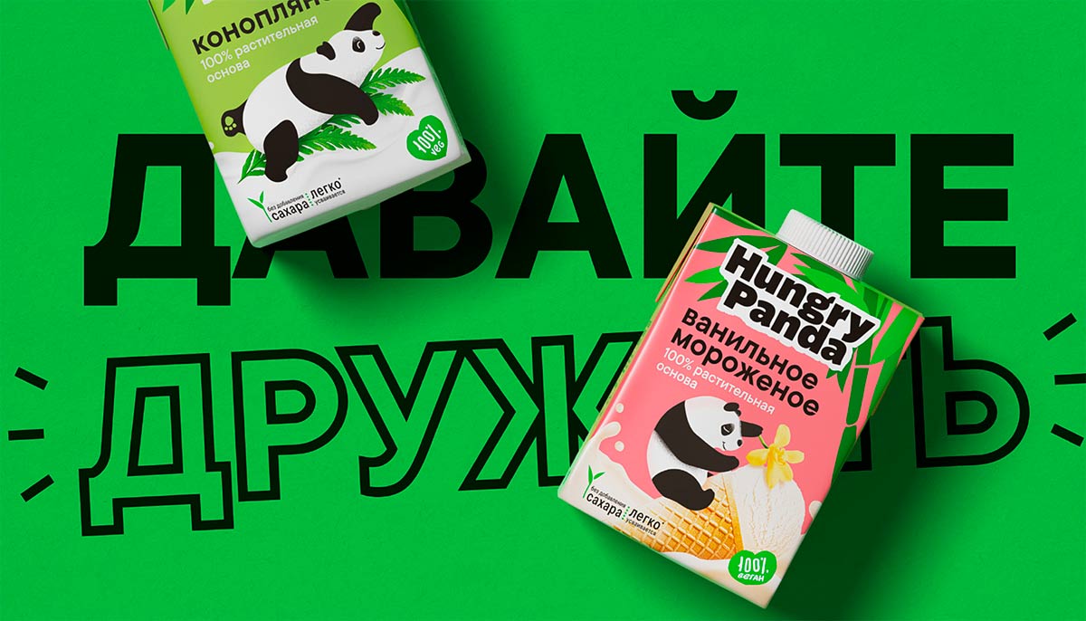 За персонажем не закреплено место, как это часто бывает на упаковках, но за ним закреплено действие, раскрывающее в полной мере характер бренда и уникальность дизайна. Панда лежит на кокосе, плывет на листочке конопли, мешает ложкой суп.