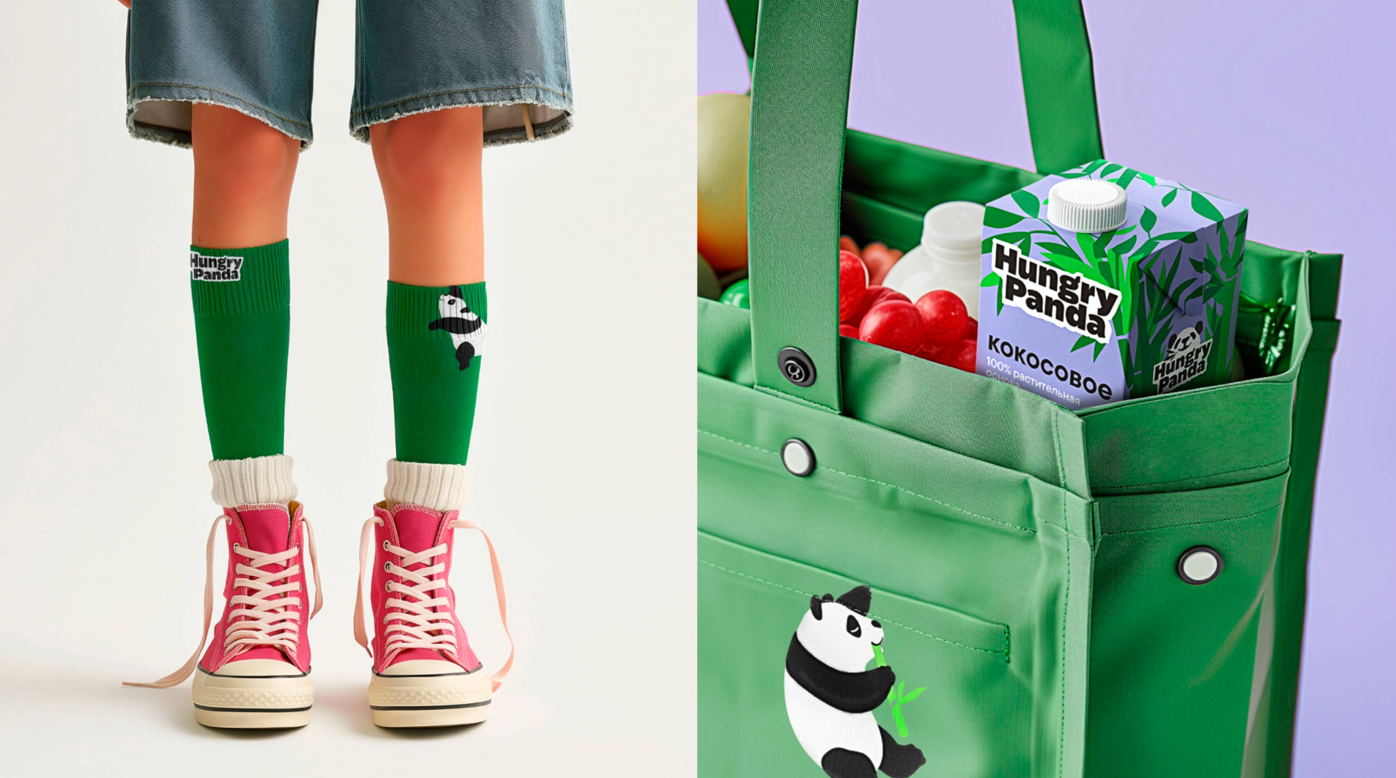 Миссия бренда — продвигать идеи дружелюбия и гармонии. Специалисты агентства хотели визуально выразить любознательный, искренний, открытый характер бренда, который поддерживает ответственное потребление. Для этого дизайнеры создали игривую панду, которая взаимодействует со всеми элементами на макете: двигает буквы, прыгает на них, ломает строчки, выглядывает из-за угла или из-за человека, играет с предметами.