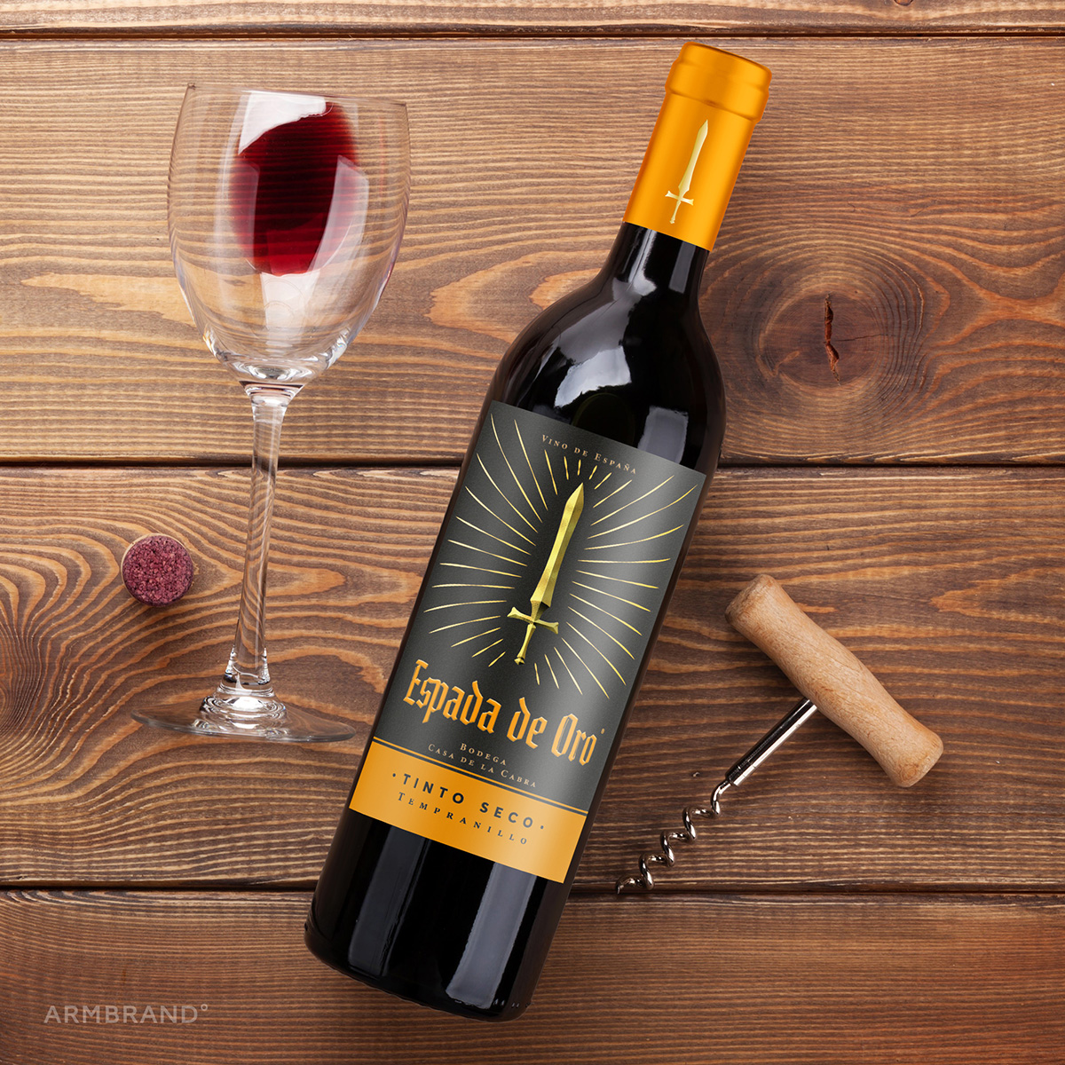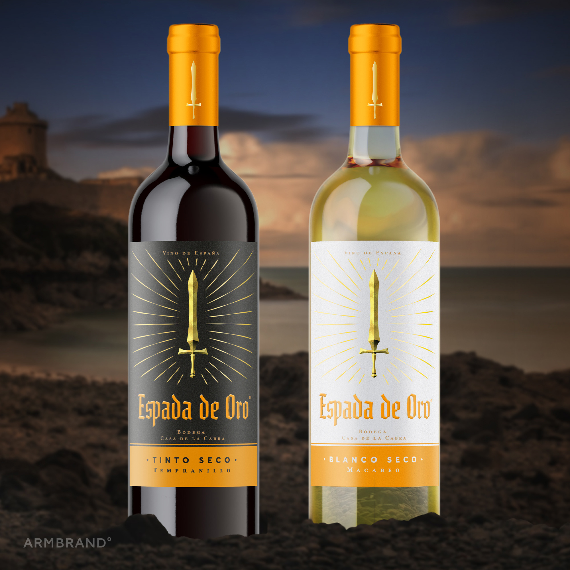 Название ESPADA DE ORO («Золотой Меч» по-испански) фонетически созвучно слову España и способно к эффективным маркетинговым коммуникациям. Объемный золотой меч в геральдическом ключе поддерживает семантику названия и притягивает внимание.