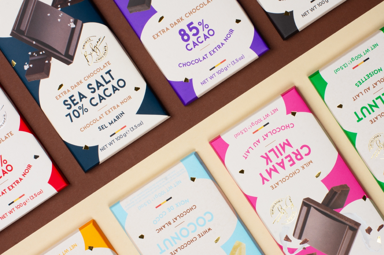 Поскольку в ассортимент входит много разновидностей шоколада, дизайнеры решили разработать повторяющийся образ, но с разнообразными цветами, пишет Upakovano.ru. Целью было получить динамичный дизайн с кусочками шоколада и ингредиентами, летающими вокруг.