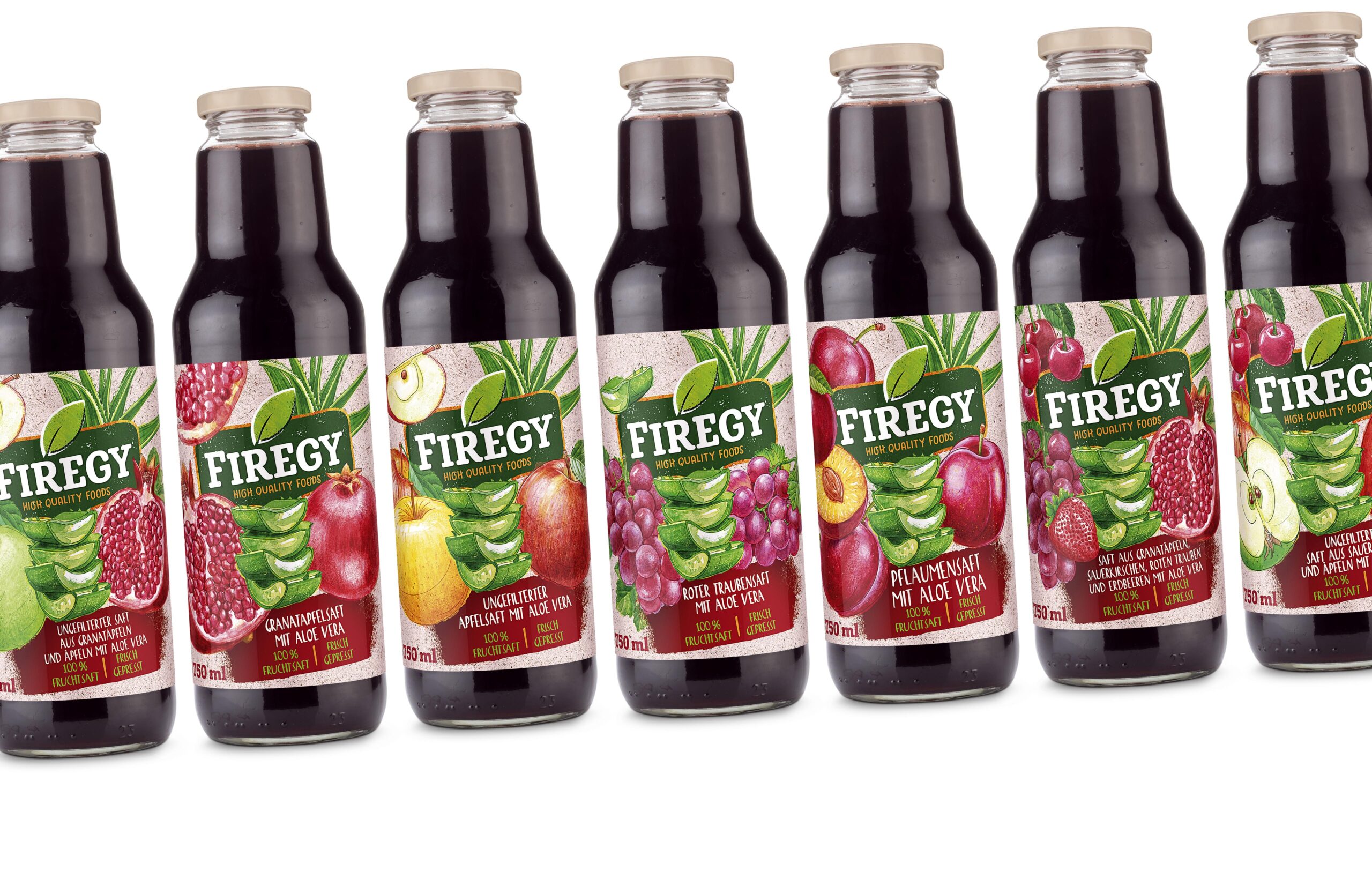 Под маркой Firegy выпускается целый ассортимент полезных для здоровья продуктов питания. Они производятся в Венгрии, а реализуются в странах Европы. В агентство обратились за дизайном упаковки для линейки соков с добавлением алоэ вера. Поскольку это дорогостоящий и полезный продукт, дизайн должен был отражать высокое качество соков и подчёркивать нетривиальность вкусовых комбинаций.