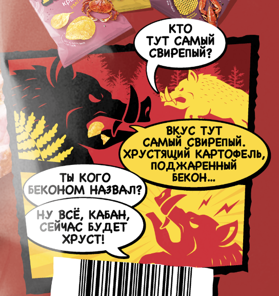 Дерзость и спонтанность зашита в ДНК бренда и заметна уже на полке: яркая упаковка, интересные вкусы и их оригинальные названия — например, Свирепый Кабан, Зубастый Краб, Дикий Лосось, Грозный Лобстер. Названия и комиксы про вкусы на обратной стороне упаковки тоже стали частью кампании, разработанной в Rodcher Creative.