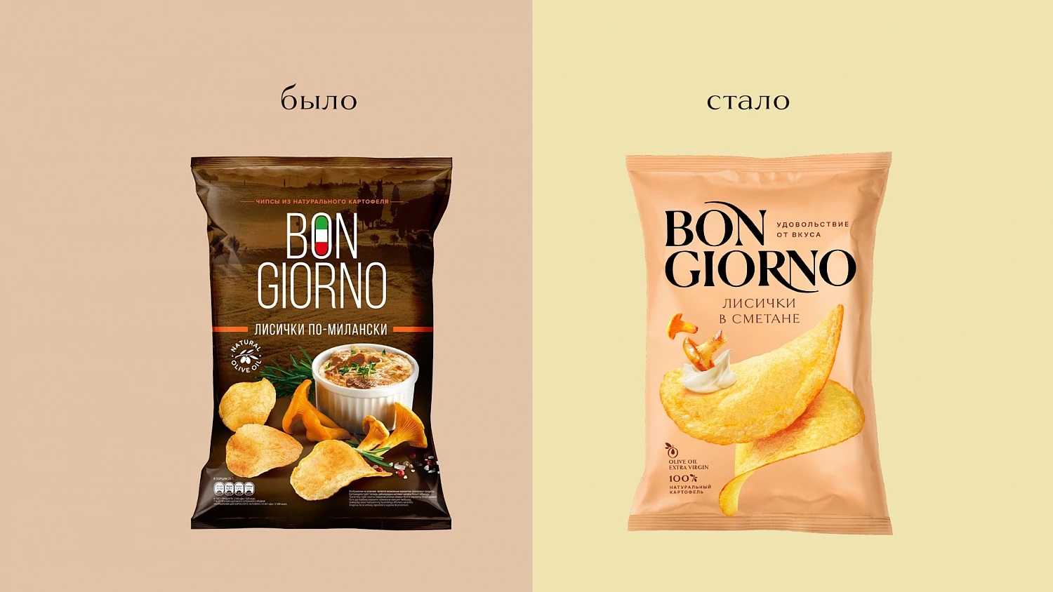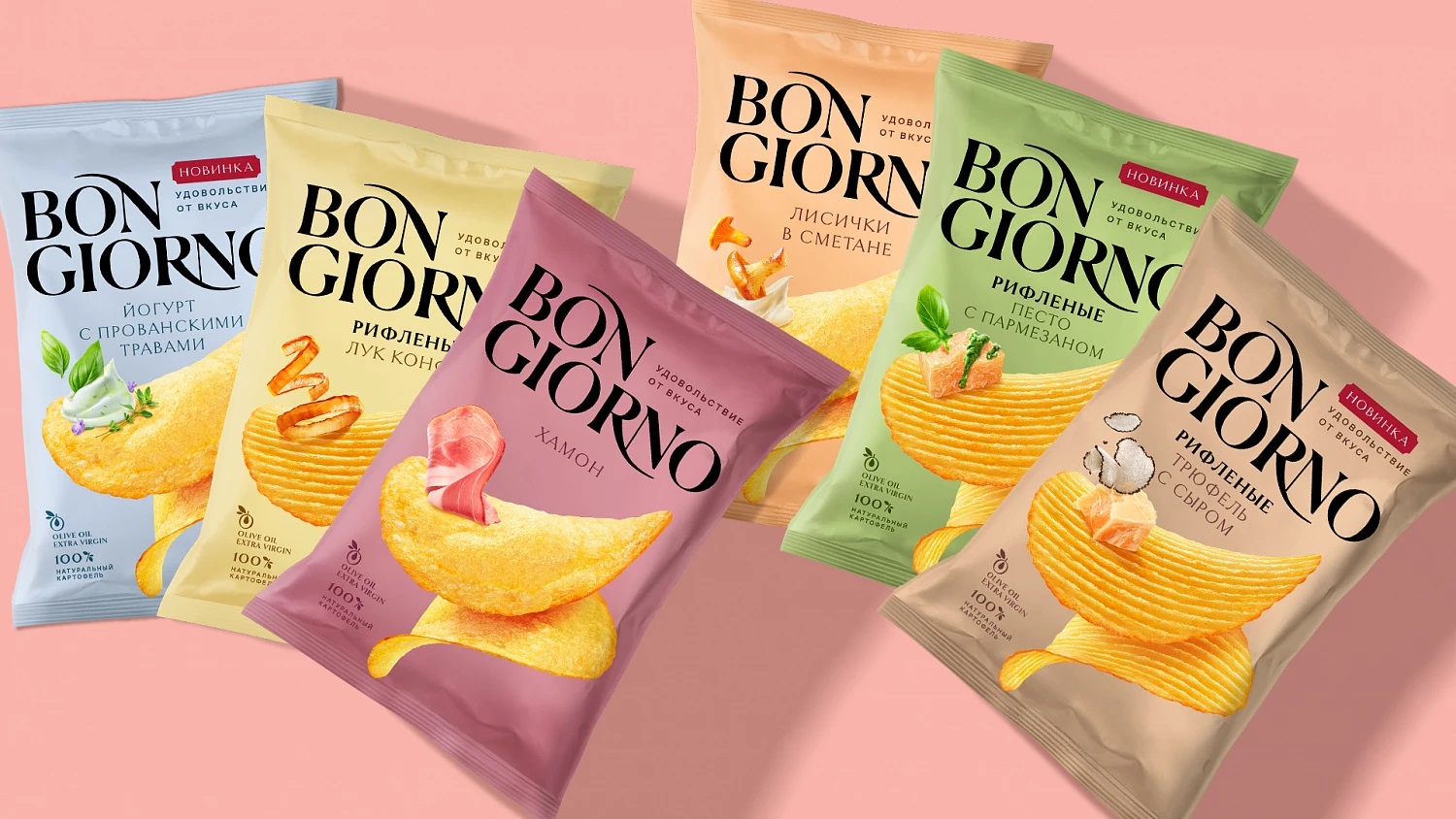 Bon Giorno — торговая марка чипсов из натурального картофеля от компании ООО «Черноголовка». Бренд присутствует на рынке снеков с 2019 года, но всё ещё не пользовался популярностью среди своей целевой аудитории. Для решения проблемы компания провела исследование, где выяснилось, что бренду необходимо менять не только своё позиционирование, но и дизайн упаковки. Ранее у нас уже были успешные совместные проекты с командой «Черноголовки», поэтому коллеги вновь обратились к нам за помощью.