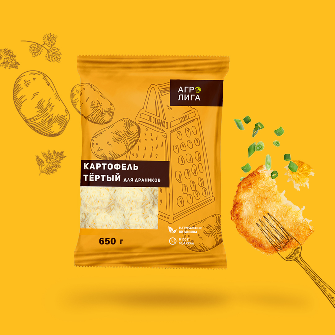 Фермерское хозяйство «Агролига» вернулись в агентство с задачей разработать дизайн упаковки картофеля тёртого для драников, встроив его в имеющуюся линейку продукции, которую в Muffin Group разрабатывали ранее.