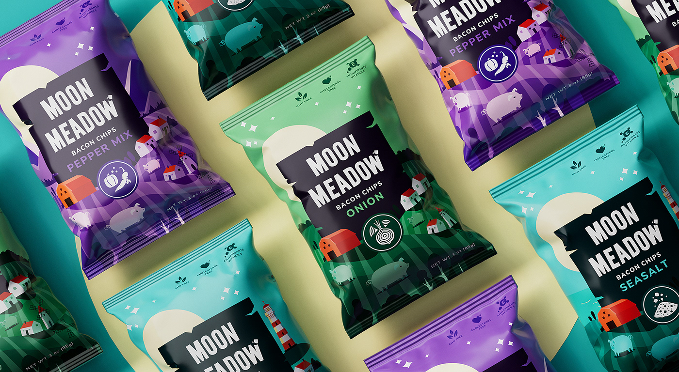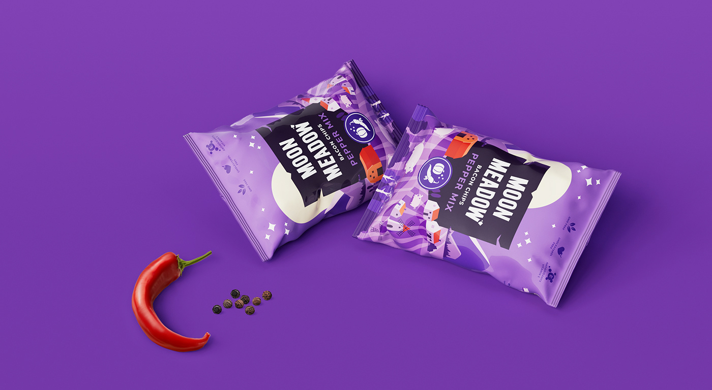 Moon Meadow — это новый вид снэков — чипсов из бекона. В продукте отсутствует холестерин и содержится 70% белка. Перед дизайнерами стояла задача трансформировать оригинальный испанский снэк в нечто современное и популярное. Нужна была большая идея, смелый дизайн и аутентичный визуальный стиль.
