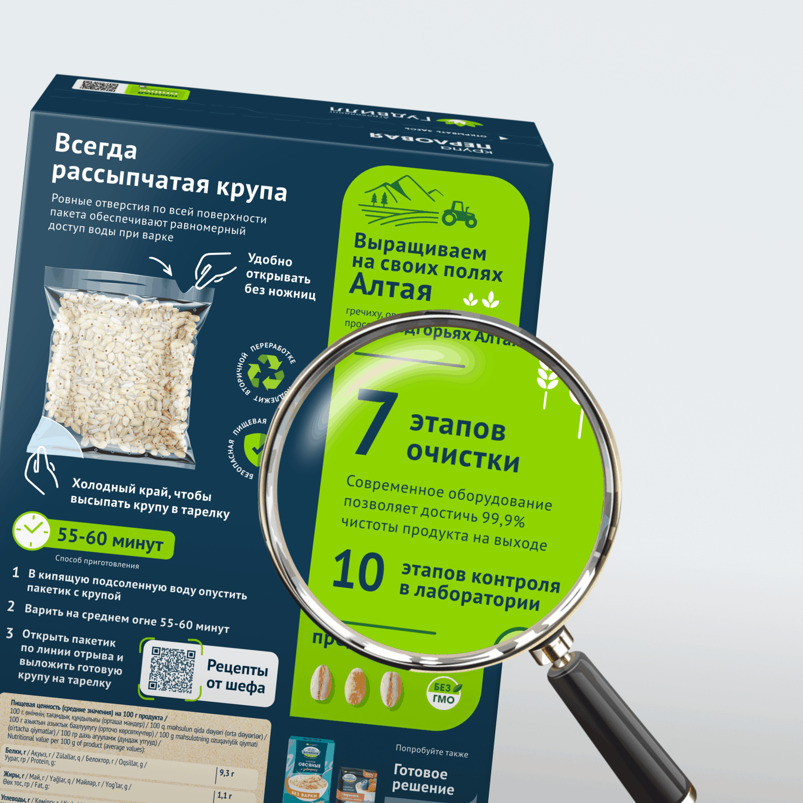 Обновленная упаковка сохраняет идентификацию с основной линейкой круп и акцентирует внимание на идее удобства, что особенно важно для покупателей, стремящихся к легкости в приготовлении пищи.
