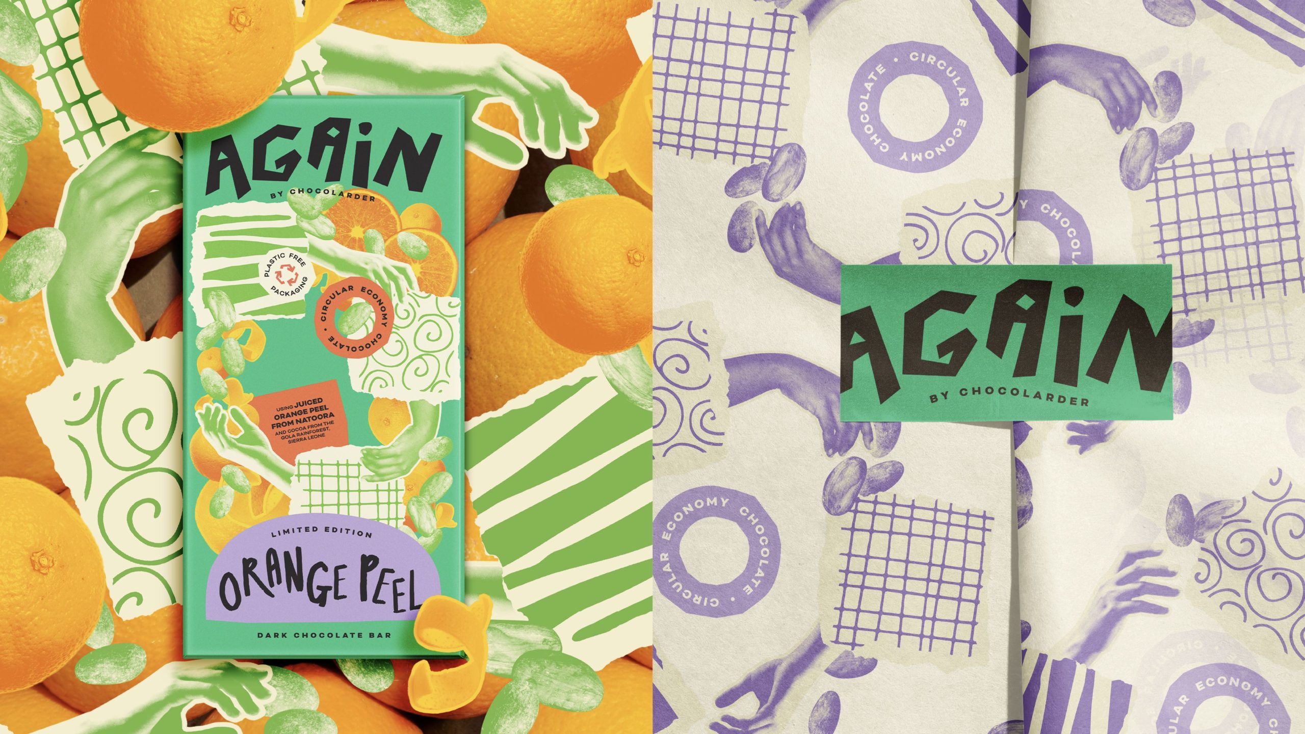 В студии уже работали с компанией Chocolarder над их основным брендом в 2018 году, и теперь производитель обратился к дизайнерам с просьбой оформить расширение ассортимента. В линейку Again вошли три плитки шоколада с разными вкусами. В их создании использованы пищевые отходы, которые в противном случае были бы выброшены. Так производитель намерен обратить внимание на проблему пищевых отходов внутри индустрии. Он хочет показать, что то, что некоторые считают отходами, можно использовать другими способами, пишет Upakovano.ru.