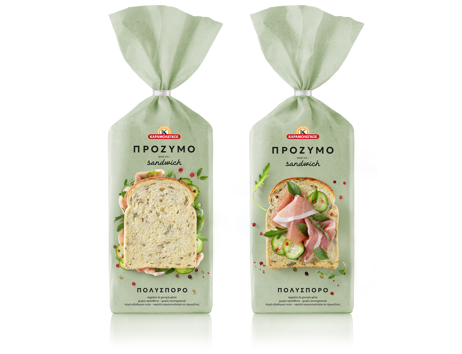 Дизайн упаковки для греческого бренда хлеба Karamolegos сочетает в себе натуральную эстетику и современный минимализм. В оформлении использованы приглушённые тона, что отражает простоту и качество бренда. Это идеально сочетается с натуральностью и питательностью продукта.