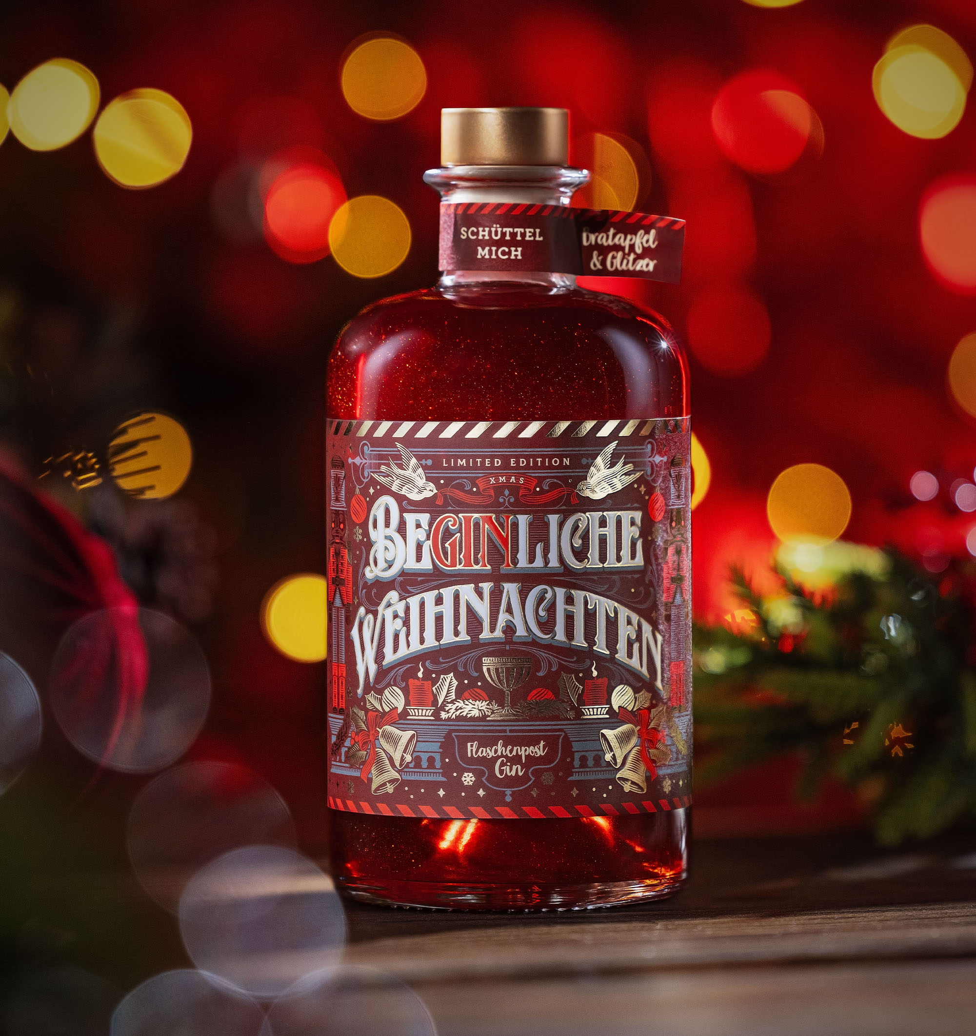 Лимитированную рождественскую серию джина BeGinliche Weihnachten выпустила немецкая компания Flaschenpost Gin. Производитель уделяет большое внимание каждой детали, начиная с качества напитков и заканчивая сверкающими блёстками, которые делают напиток абсолютно волшебным.