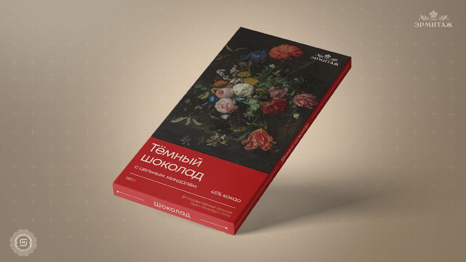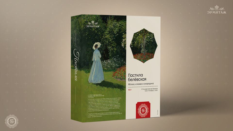 В оформлении упаковок сладостей использовались элементы с картин мастеров из собрания Эрмитажа: Поля Сезара Элле, Клода Моне, Адриана ван Утрехта, Анри-Шарля Мангена и Яна Давидса де Хема.