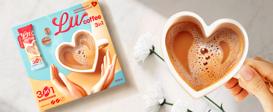 Перед специалистами стояла задача создать новый бренд и дизайн упаковки для растворимого кофе 3 в 1, предназначенного для рынков Казахстана и России. Основная цель — передать высокое качество и уникальность настоящего вьетнамского кофе, создавая запоминающийся образ продукта.