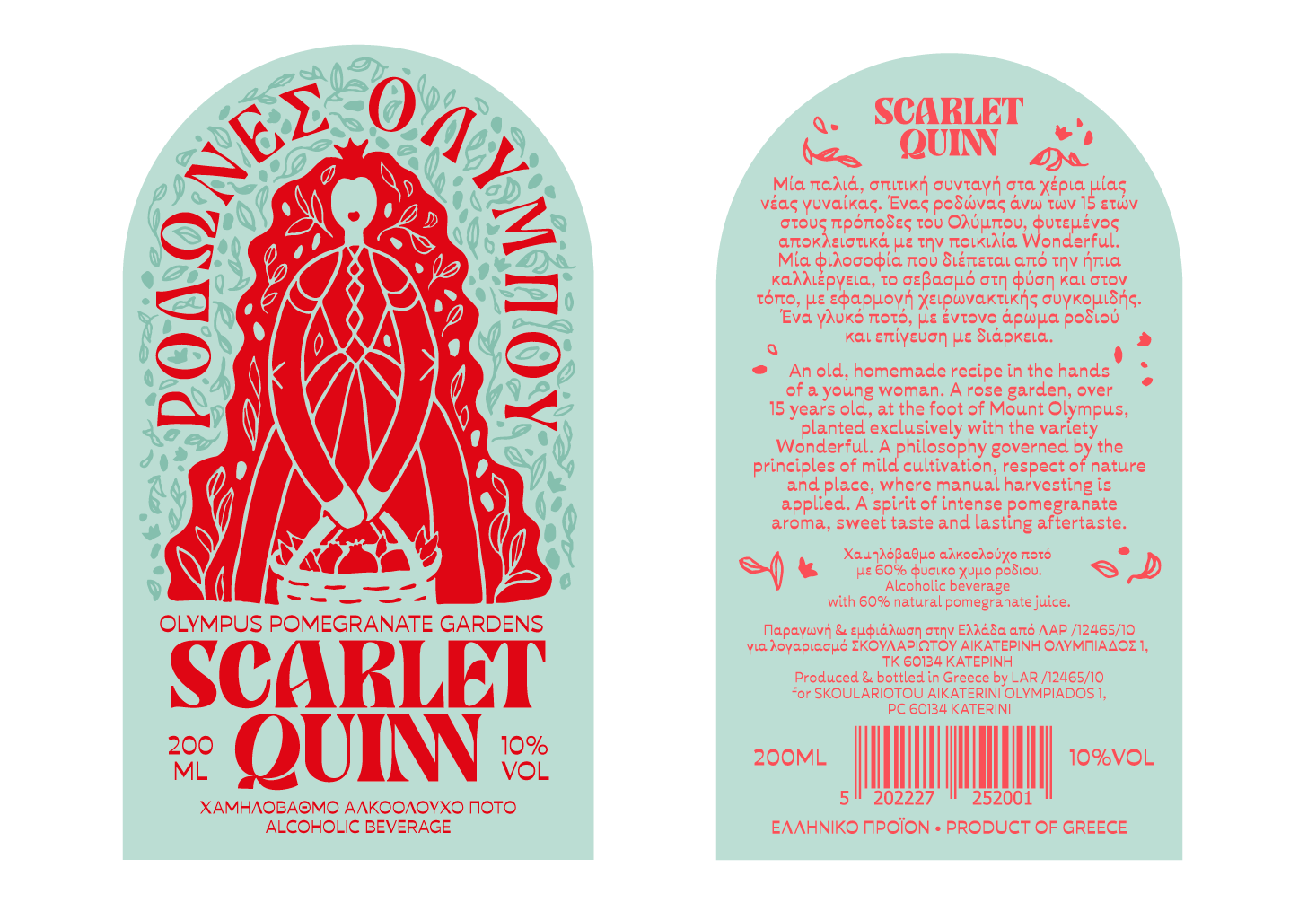 Дизайн создавался для бутылок объёмом 200 и 500 мл. Специалистам студии удалось уловить уникальность ремесленного напитка, вдохновлённого гранатом. Название Scarlet обусловлено тёмно-красным цветом граната, а Quinn вызывает образ знатного, но приземлённого человека – вымышленного владельца гранатовых садов.