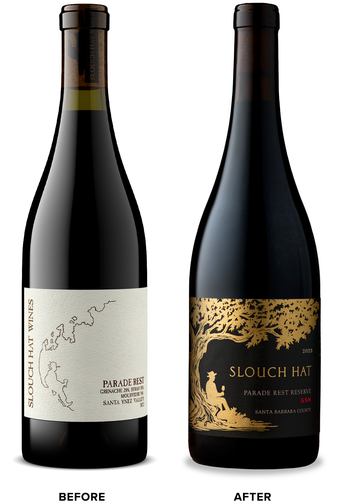 Вина Slouch Hat воплощают в себе момент расслабления после долгого рабочего дня. Оно создано для того, чтобы после того, как работа закончена, взять бокальчик вина, откинуться на кресле и выдохнуть с облегчением. Предыдущая упаковка демонстрировала эту идею с помощью иллюстрации мужчины, наслаждающегося бокалом вина под деревом, однако её трудно было разглядеть с расстояния на прилавке магазина. Структура этикетки вынуждала поворачивать бутылку по часовой стрелке, чтобы рассмотреть сорт винограда, но тогда скрывалось название бренда.