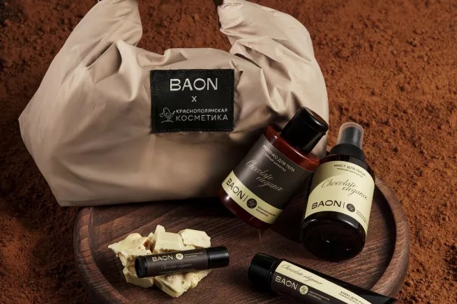 Бренды BAON и «Краснополянская косметика» объединились в коллаборации, результатом которой стала лимитированная коллекция уходовых средств Chocolate Elegance. Линейка включает четыре продукта: бальзам для губ, мист для лица, крем для рук и молочко для тела.
