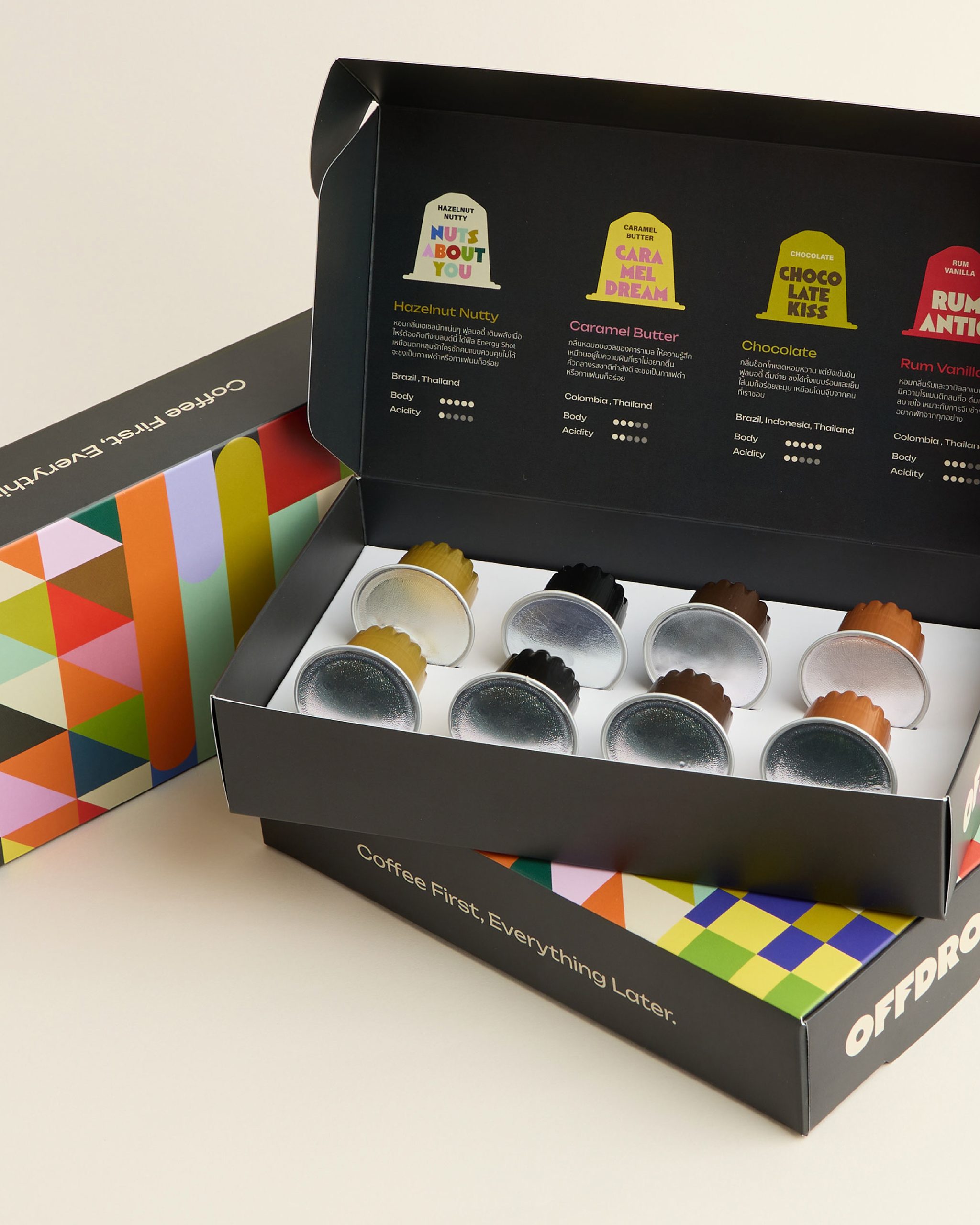 Offdrome — бренд кофейных капсул, родившийся в Гонконге. Он превращает ежедневный ритуал употребления кофе в потрясающий опыт. Упаковка разительно отличается от традиционных брендов, представленных в категории кофе. Здесь нет традиционного минимализма. Вместо этого в оформлении используются яркие цвета, геометрические узоры и крупные шрифты, которые позволяют мгновенно выделить каждый вкус продукта.