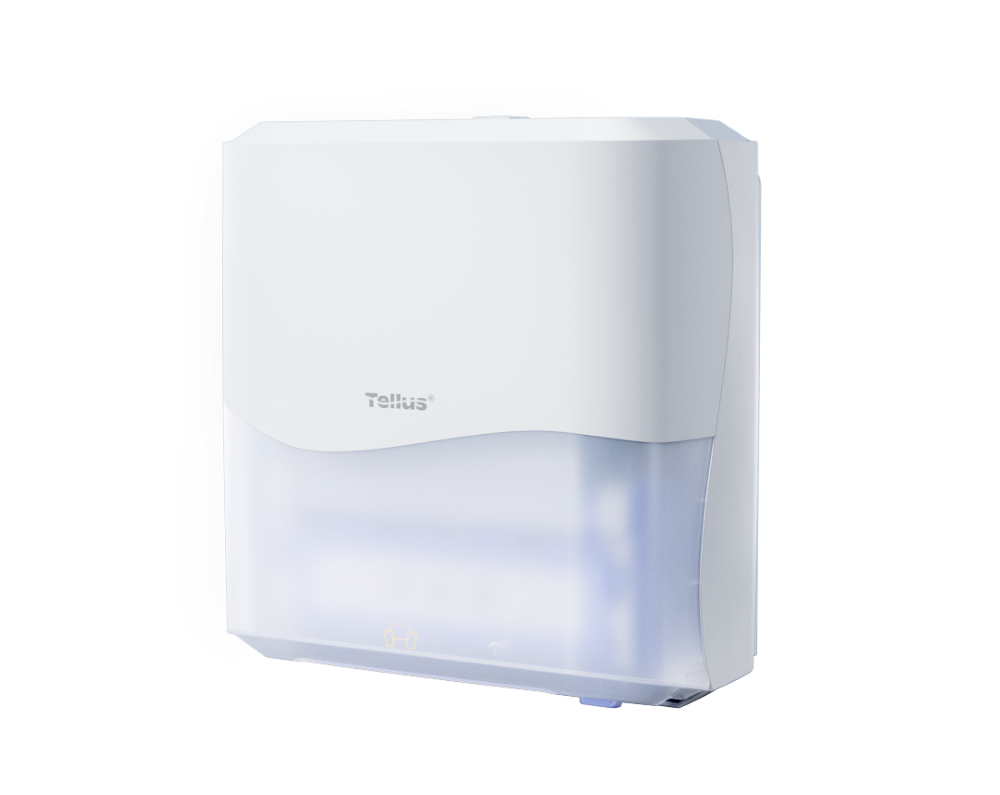 Новые диспенсеры сочетают функциональность и стильный облик. Элегантные, плавные линии отсылают к фирменной волне Tellus, символизируя движение бренда вперед. Лаконичный и универсальный дизайн диспенсеров подходит к любому интерьеру, а плоская крышка, на которую можно положить телефон или салфетки, создает дополнительное удобство для гостей. Диспенсеры Tellus Wave Design® производятся из ABS-пластика, который легко перерабатывается.