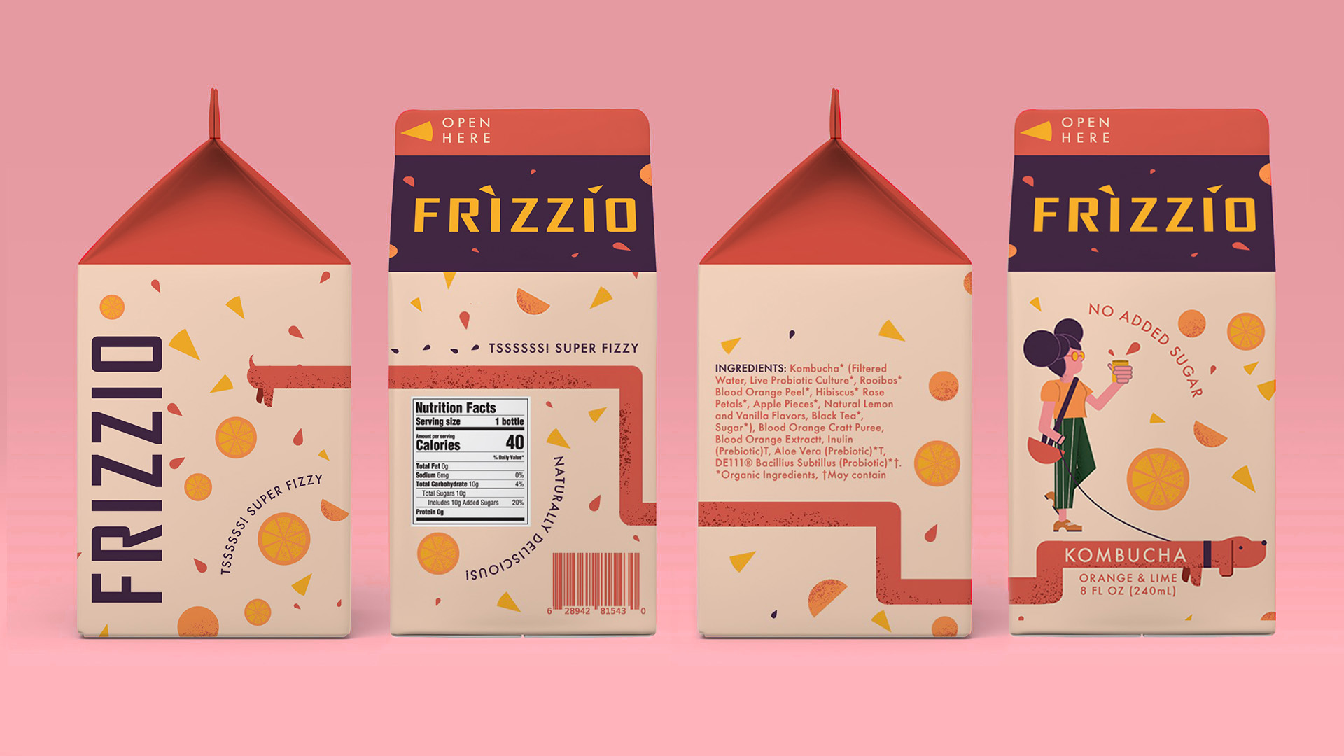 Frizzio — это комбуча, которая по‑новому переосмысливает ностальгический мир старомодных коробок для сока. Упакованный в переработанный Tetra Pak, этот напиток будто сошёл со страниц прошлого, но с дерзкой интонацией поколения Z.