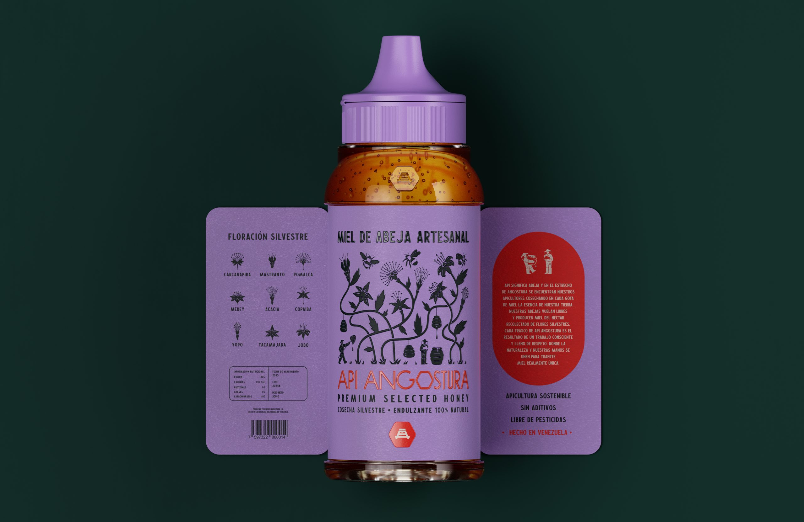 Созданный с уважением к устойчивым методам пчеловодства, бренд вдохновлён природным богатством джунглей на берегах пролива Ангостура — местом, где редкие дикие цветы дарят жизнь уникальному мёду. Визуальная концепция Api стала настоящим гимном «нектару земли»: каждая деталь, от иллюстраций эндемичной флоры до формы бутылки и логотипа, тщательно разработана так, чтобы подчеркнуть происхождение и подлинность продукта. Нестандартная пурпурная палитра, отсылающая к венесуэльскому цветку мастранто, выделяет Api среди типичных жёлтых оттенков рынка и символизирует смелость бренда в выборе собственного пути.