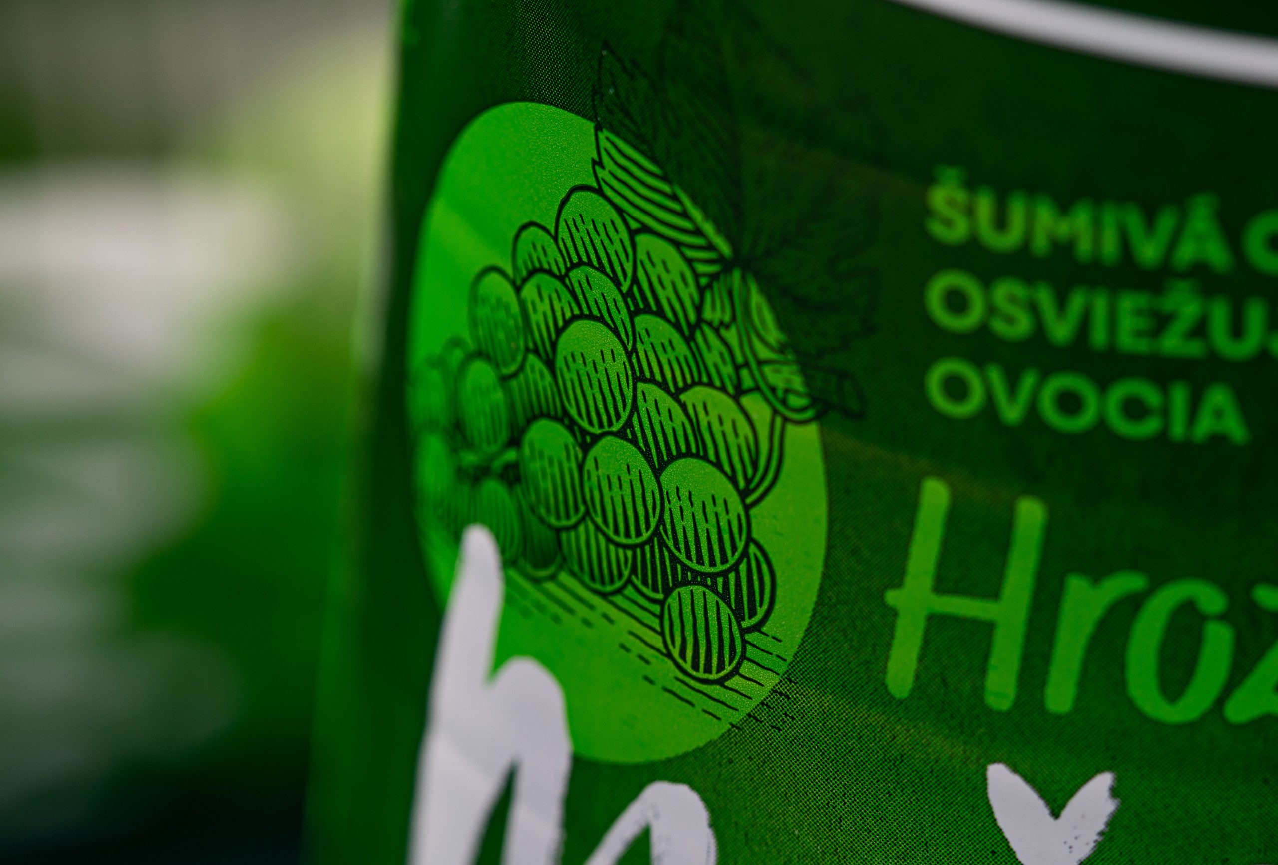 Образ газированного напитка Mušter Grape Soda создан вокруг яркой, нарисованной вручную иллюстрации виноградной грозди, которая мгновенно передает ощущение сочного вкуса и натурального содержания фруктов. Выразительный логотип, выполненный в динамичном шрифте, размещен прямо под изображением грозди, образуя единый визуальный центр композиции. Этот акцент эффектно выделяет продукт на фоне бутылки глубокого зеленого цвета и помогает напитку привлекать внимание на полке с безалкогольными напитками.