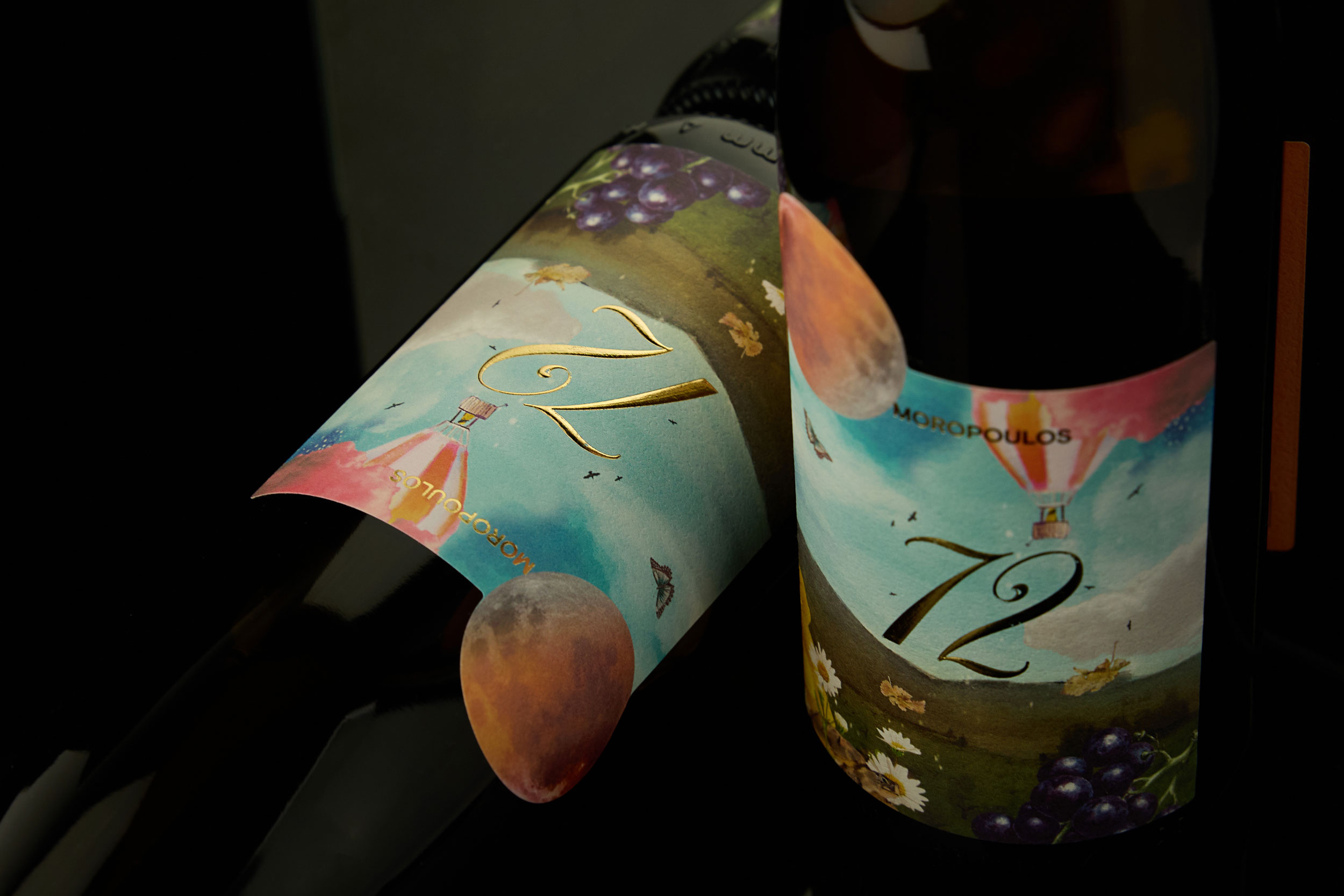 Парящие луны, воздушные шары, плывущие листья и порхающие бабочки — десятилетия сменяющихся сезонов и циклов, запечатлённые в жизни виноградника, существующего с 1972 года. Этикетка рассказывает историю ещё до того, как бутылка открыта. Вдохновлённая виноградником Мосхофилеро, впервые высаженным в 1972‑м, она передаёт ощущение лёгкости, воображения и неторопливого хода времени. Парящий шар и открытый горизонт отражают свежесть и ароматную лёгкость вина, а луна намекает на терпение, циклы природы и тихое созревание старых лоз.