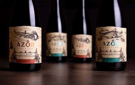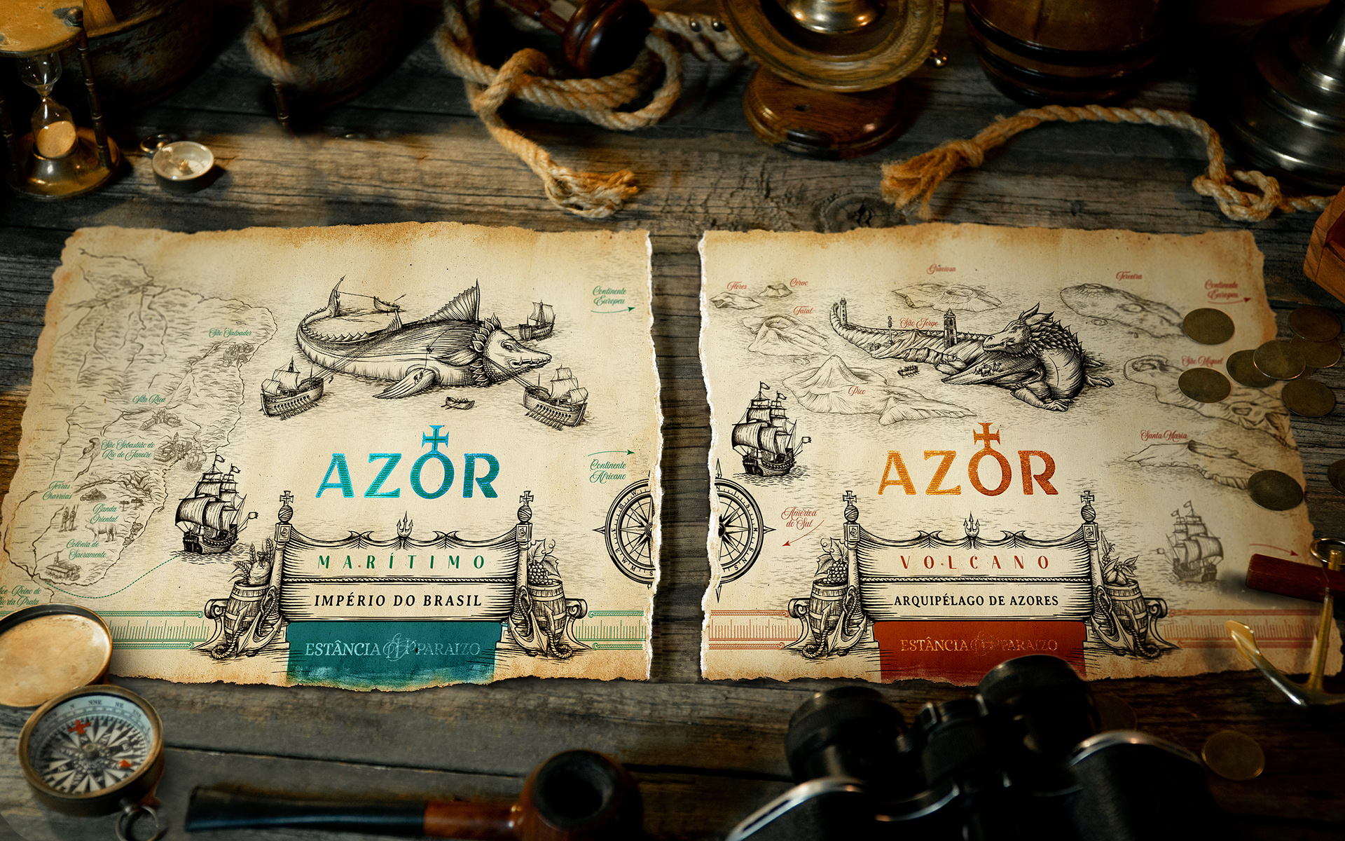 Этикетки Azor Volcano и Azor Marítimo — две части единой системы, вдохновленной картами XVI–XVII веков эпохи великих навигаций. Они рассказывают историю семьи Мерсио от Азорского архипелага до юга Бразилии, где каждая бутылка представляет собой главу саги о триумфе и пионерстве. В Azor Volcano дракон сливается с островом Сан-Жорже, символизируя вулканическую мощь. Армиллярная сфера и мальтийский крест добавляют историзма. Цветовая палитра отсылает к земле, огню и мифам архипелага. Дизайн Azor Marítimo фокусируется на атлантическом переходе 1690 года: гибрид судна и тунца олицетворяет морские опасности.